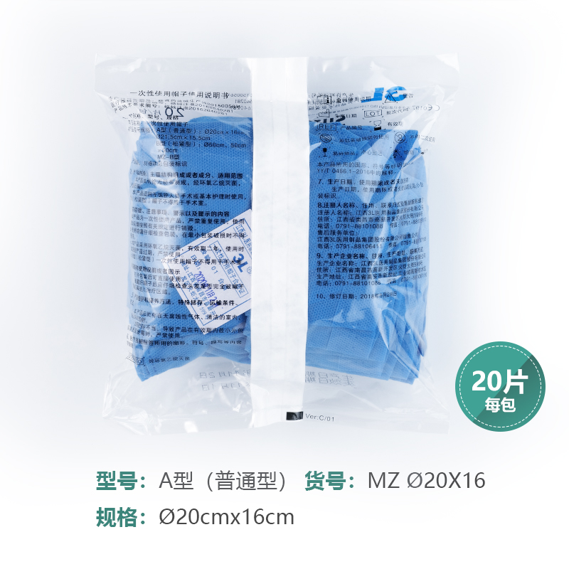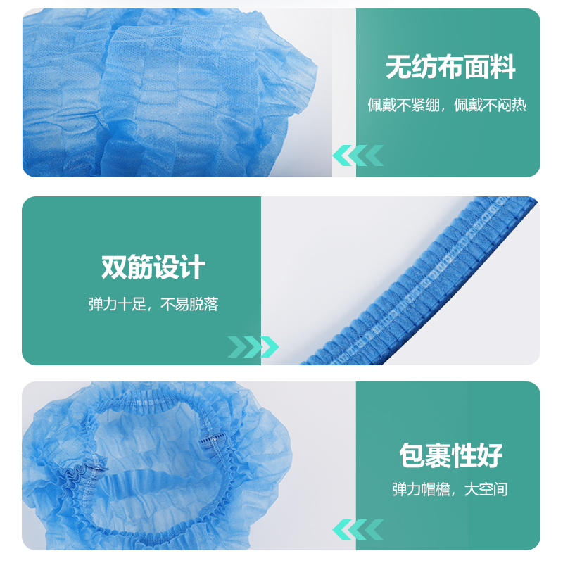 一次性使用帽子:采用无纺布、松紧带制成。适用于医护人员手术或基本护理工作时使用。