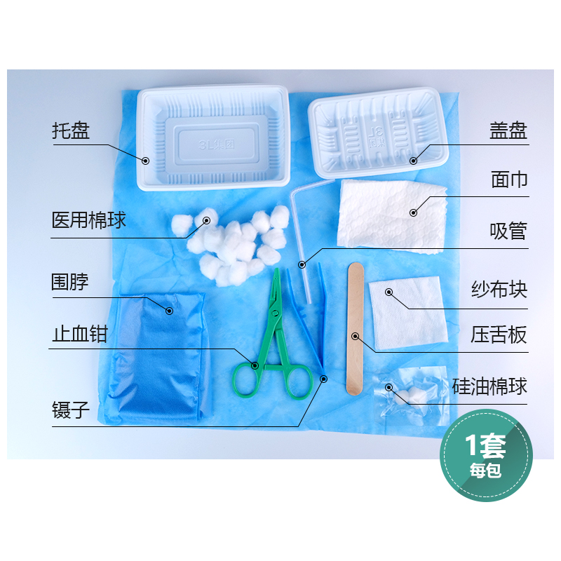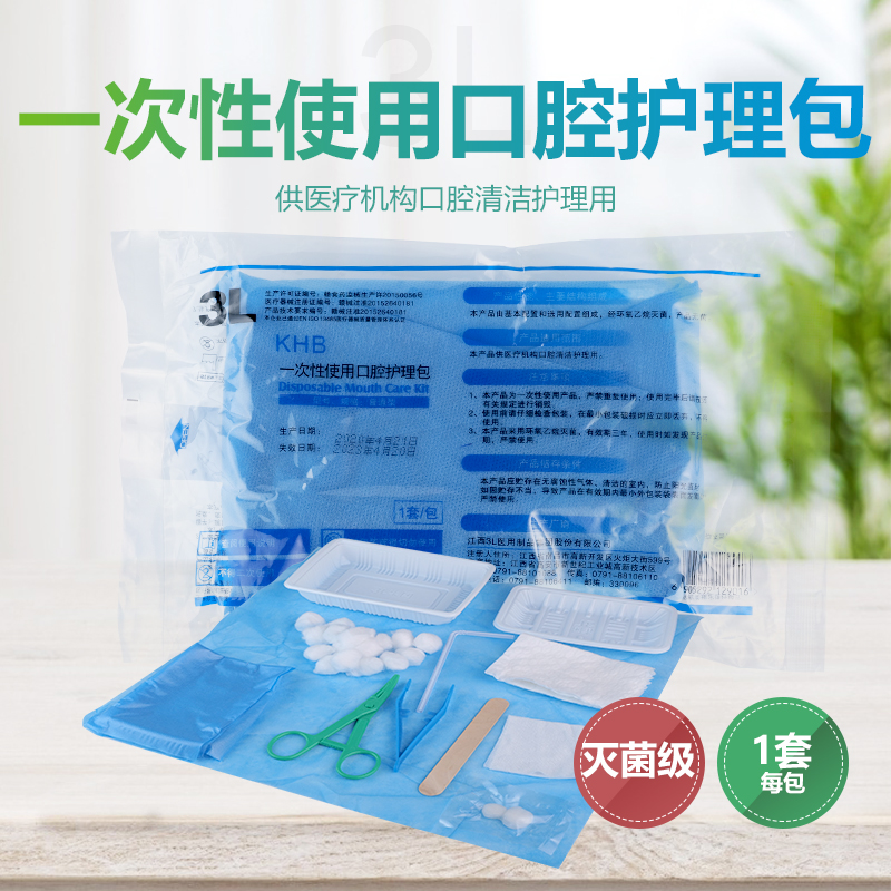 一次性使用口腔护理包:由纱布块、压舌板、医用棉球、面巾、医用敷巾等主要组件。供医疗机构口腔清洁护理用。