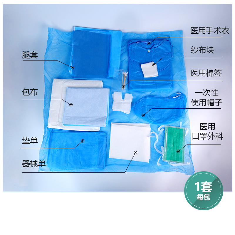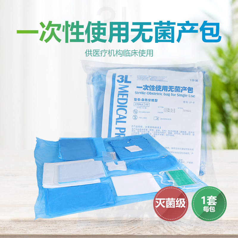 一次性使用无菌产包:由垫单、医用手术衣、婴儿护脐带等主要组件,可根据需要选配组件。供产妇自然分娩时使用。